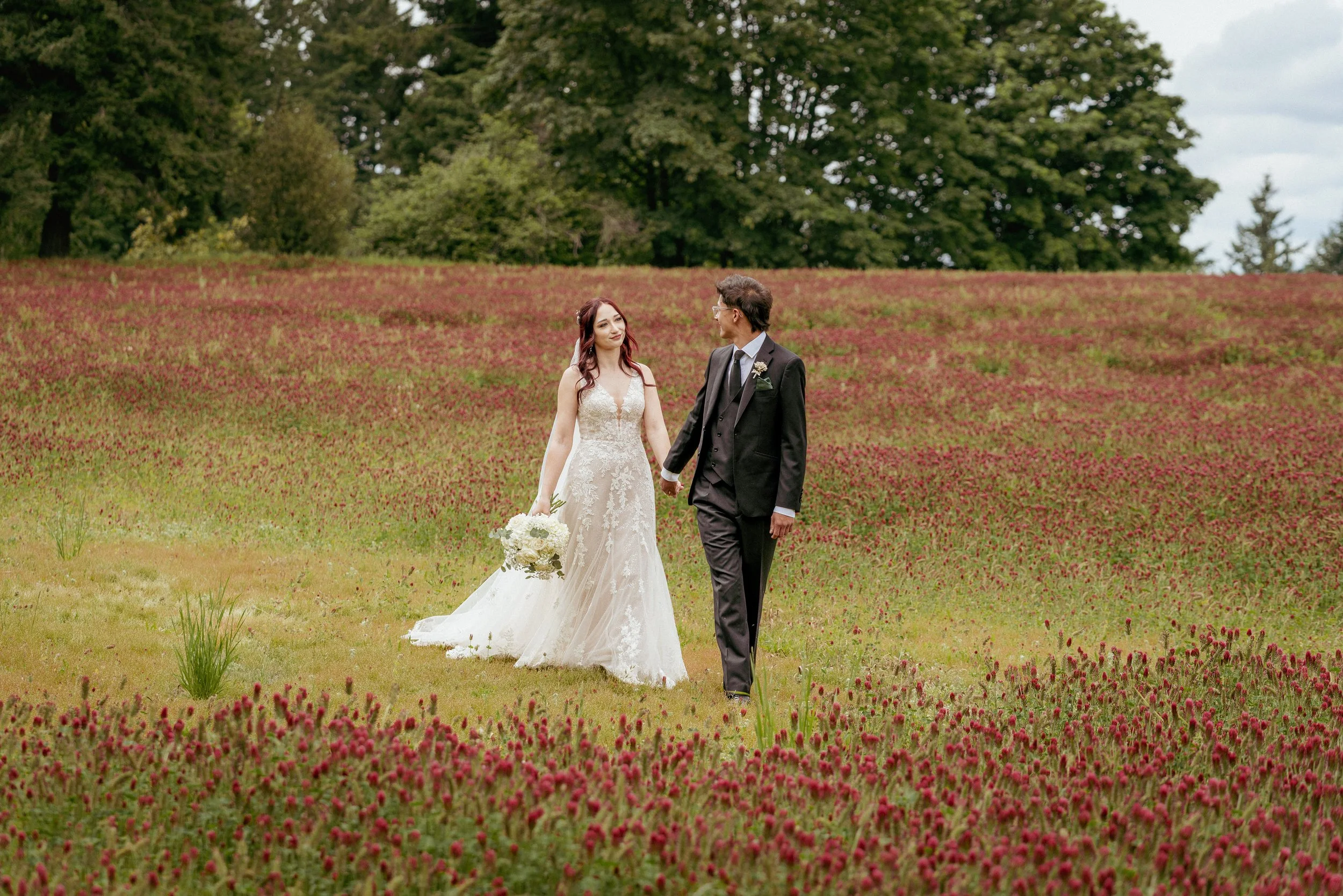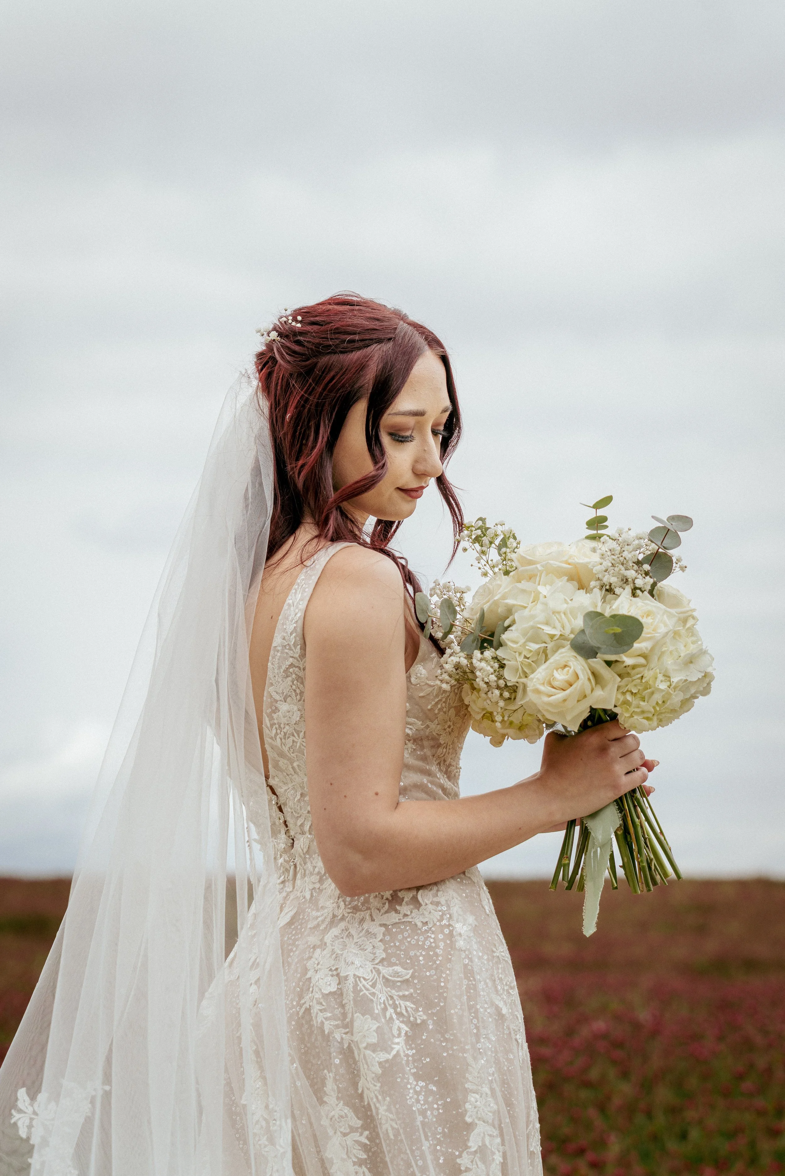 Bride with red hair in a lace wedding dress holding a bouquet of white roses and greenery outdoors on a cloudy day.
