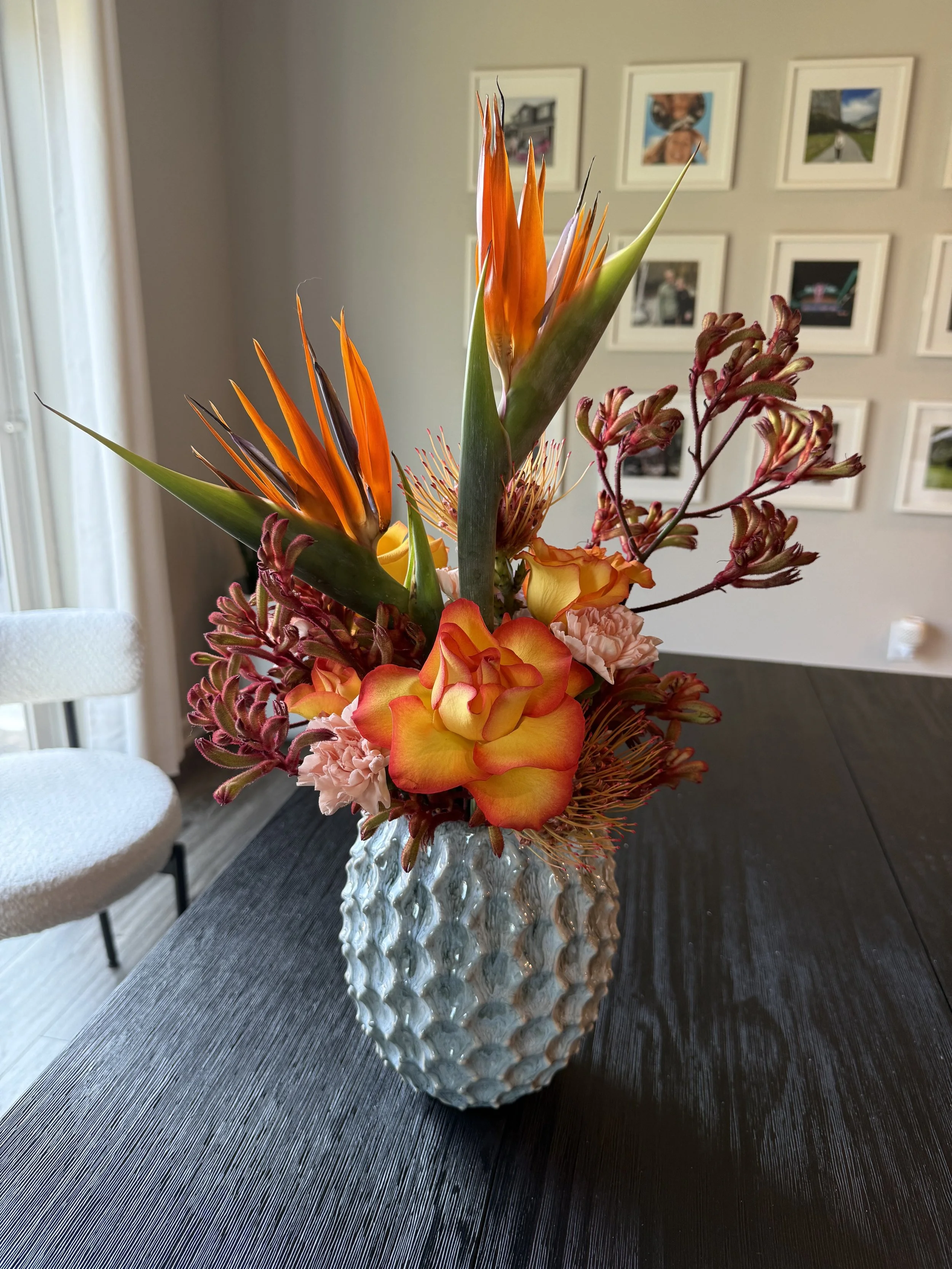 A vibrant floral arrangement in a textured white vase on a dark wooden table, with a background featuring framed pictures on a beige wall.
