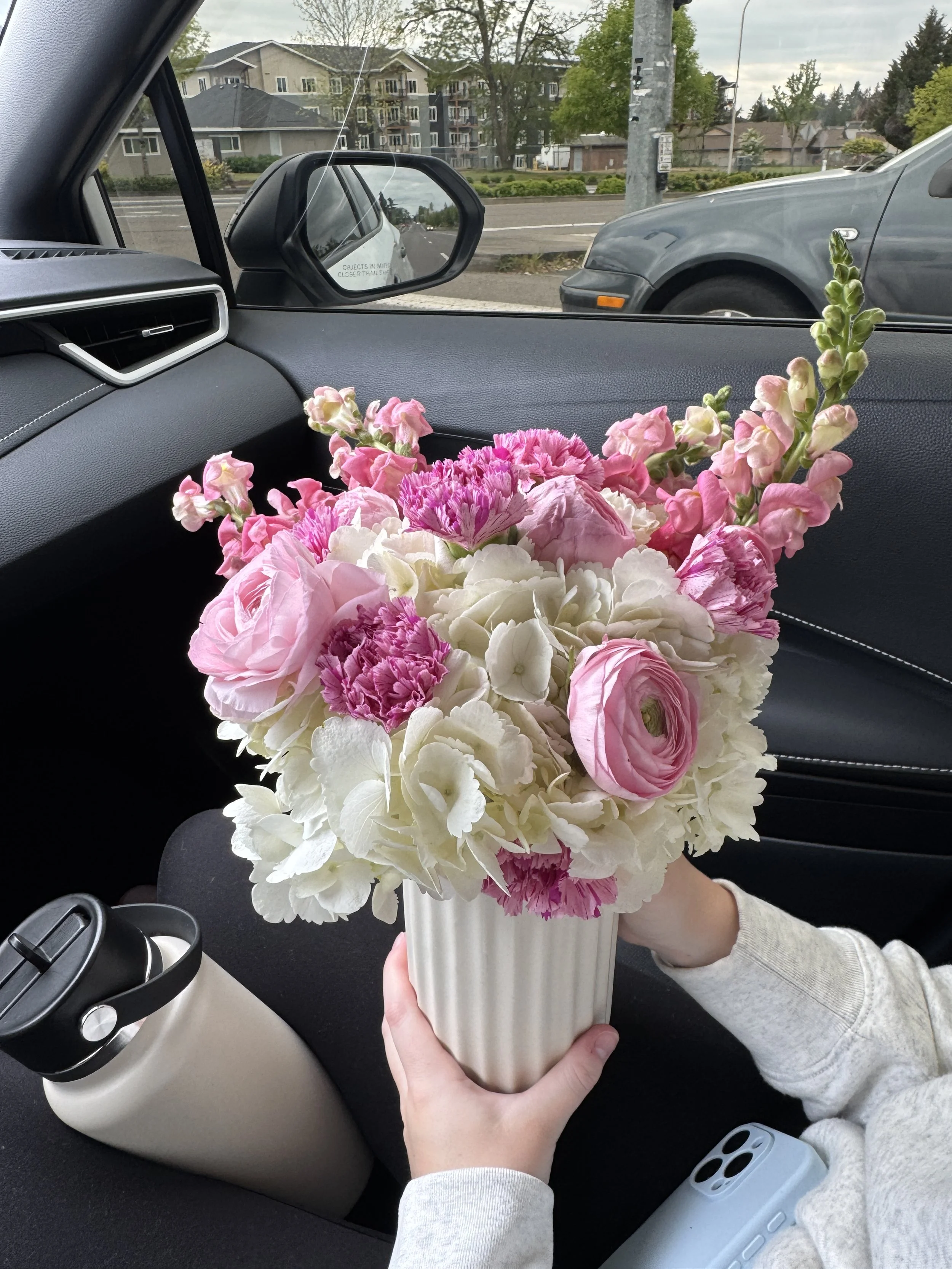 Person holding a white vase with pink, white, and purple flowers inside a car, with cars and a residential neighborhood visible outside the window.