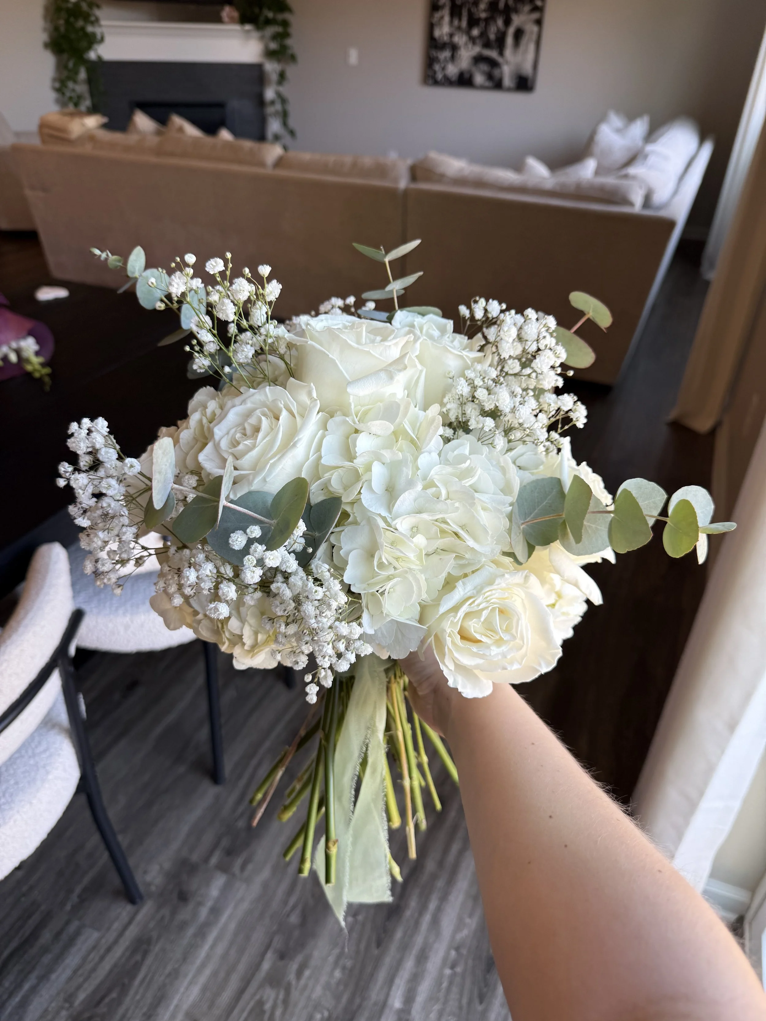 Person holding a white floral bouquet with roses, hydrangeas, baby's breath, and eucalyptus in a living room.