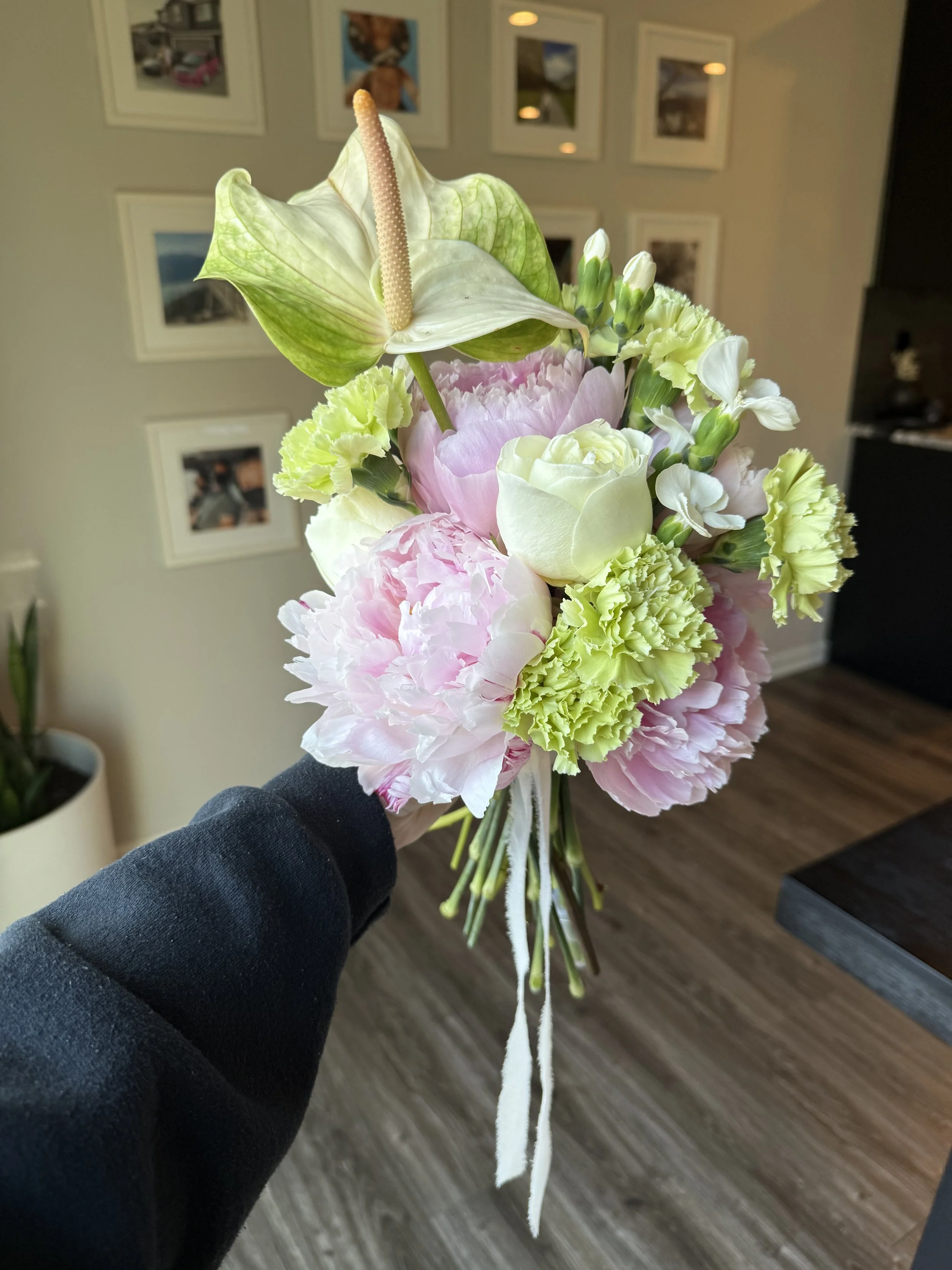 A hand holding a bouquet of pink and white flowers, including carnations, roses, and an anthurium, with a blurred background of framed photos on a wall and a plant in a pot.